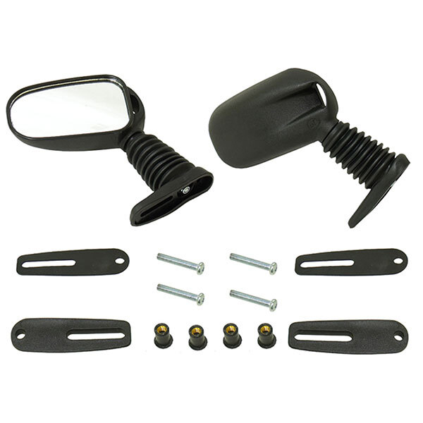 Included Items: (2) Black mirrors, (2) Black plastic mounting brackets W/rubber gaskets (4) 5mm-.80 x 30mm Pan head bolts, (4) 5mm-.80 x 15mm Pan head bolts, (4) 5mm-.80 Black rubber sleeve bolts, (4) 5mm-.80 Nylock nuts, (4) Pan head screws, (4) 5mm Flat washers